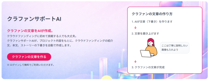 クラウドファンディングを予定されている方は、ぜひ、「クラファンサポートAI」をお試しください。あなたのアイデアや想いをAIが文章にします。