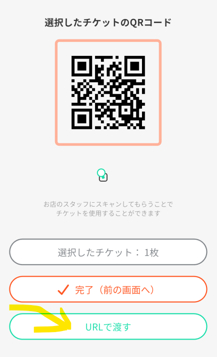 このボタンを押すと専用のURLが発行され、そのURLをお店に共有することでチケットを利用できるようになります。