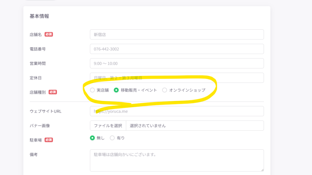 店舗を登録するフォームに「店舗種別」の項目が追加され、以下の3つから選択できるようになりました。